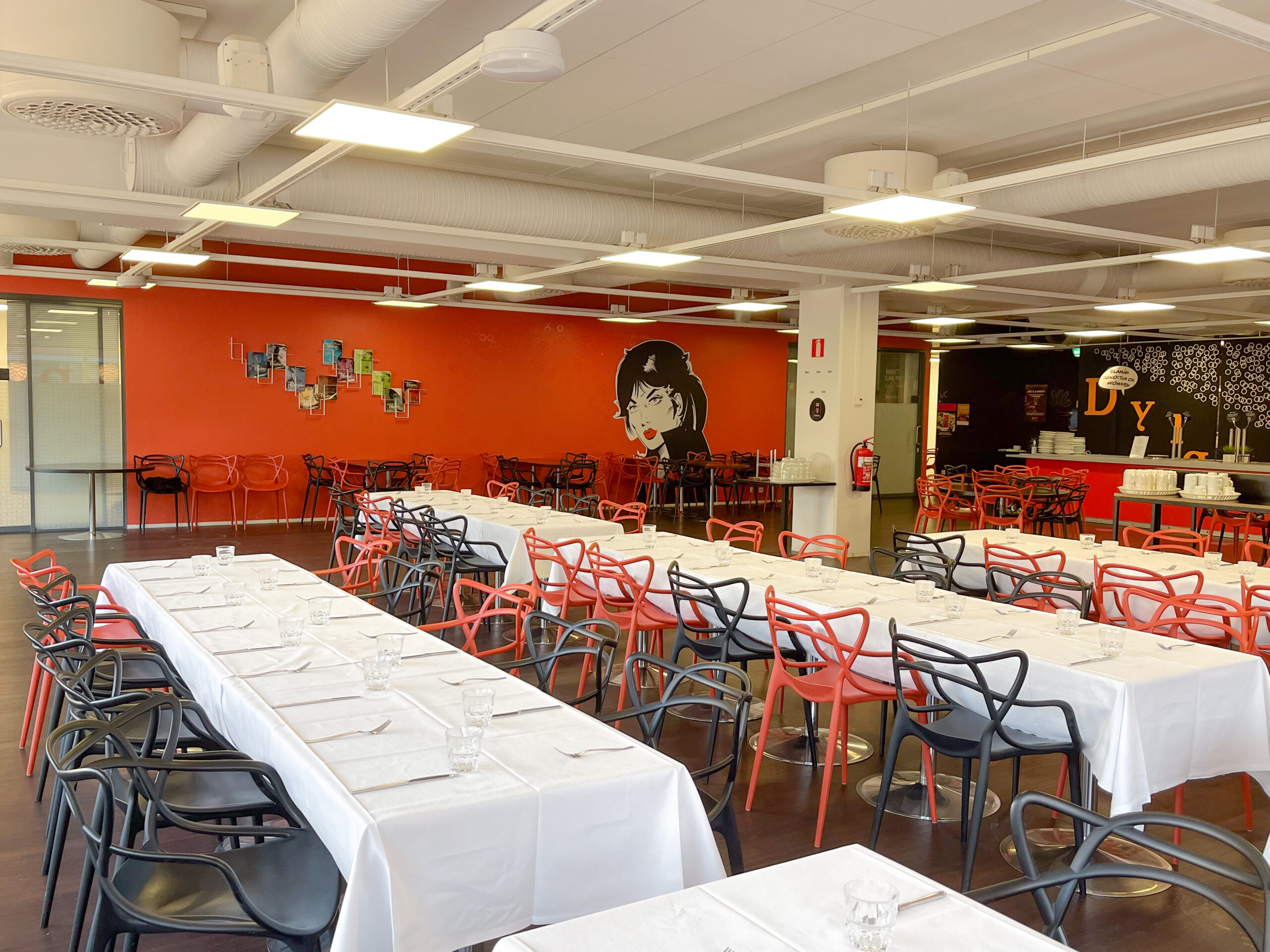 Located in Oulunkylä, right near Käpylä train station, Tuusulanväylä, and Musta Pekka, the restaurant can host 150 guests for a seated event or 200 for a cocktail reception. The venue also has two rentable meeting rooms (for 26 and 8 people), which can also be booked for evening events.