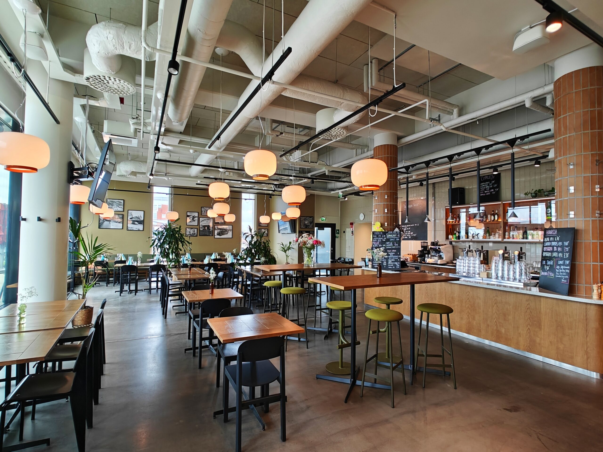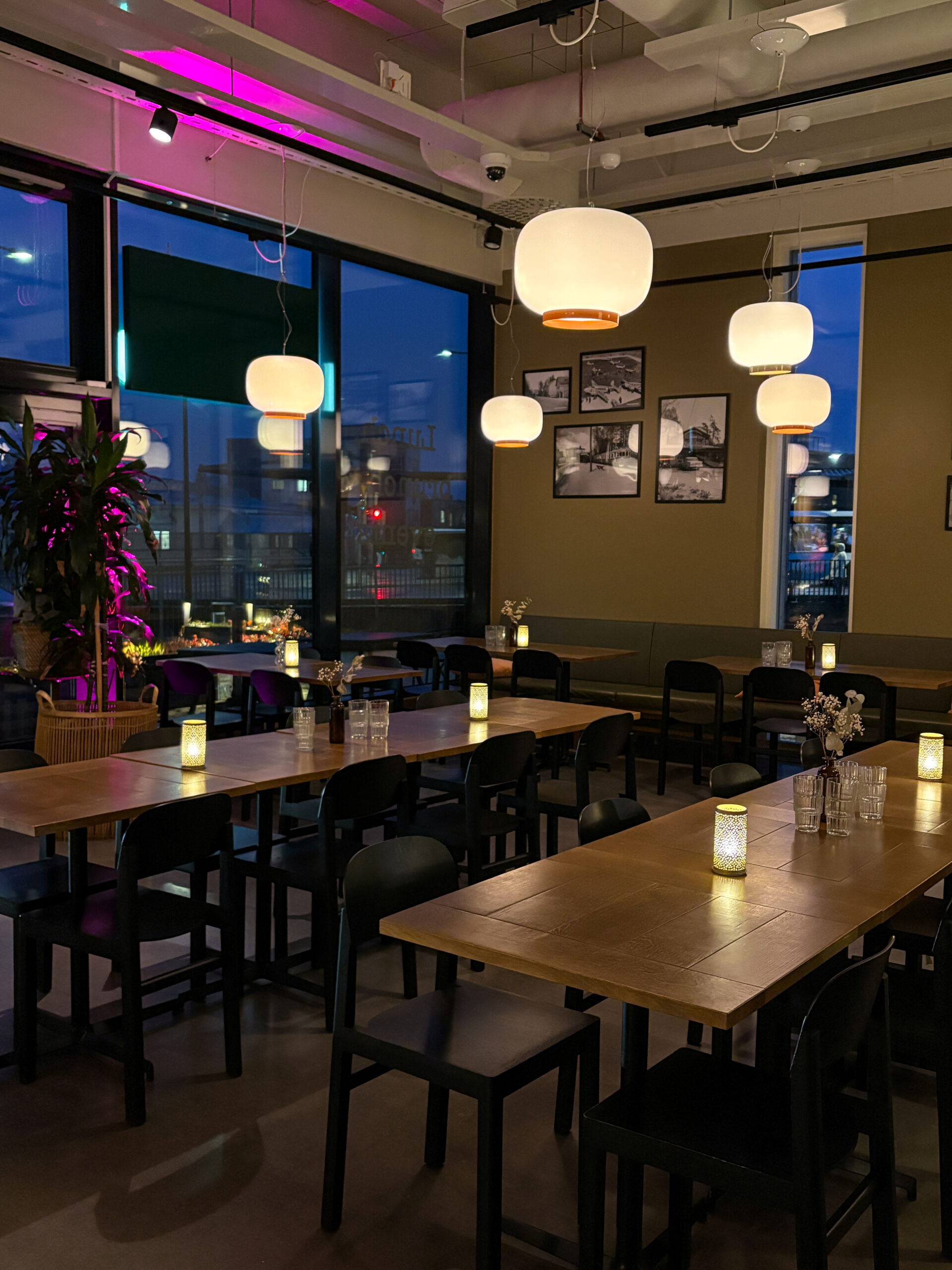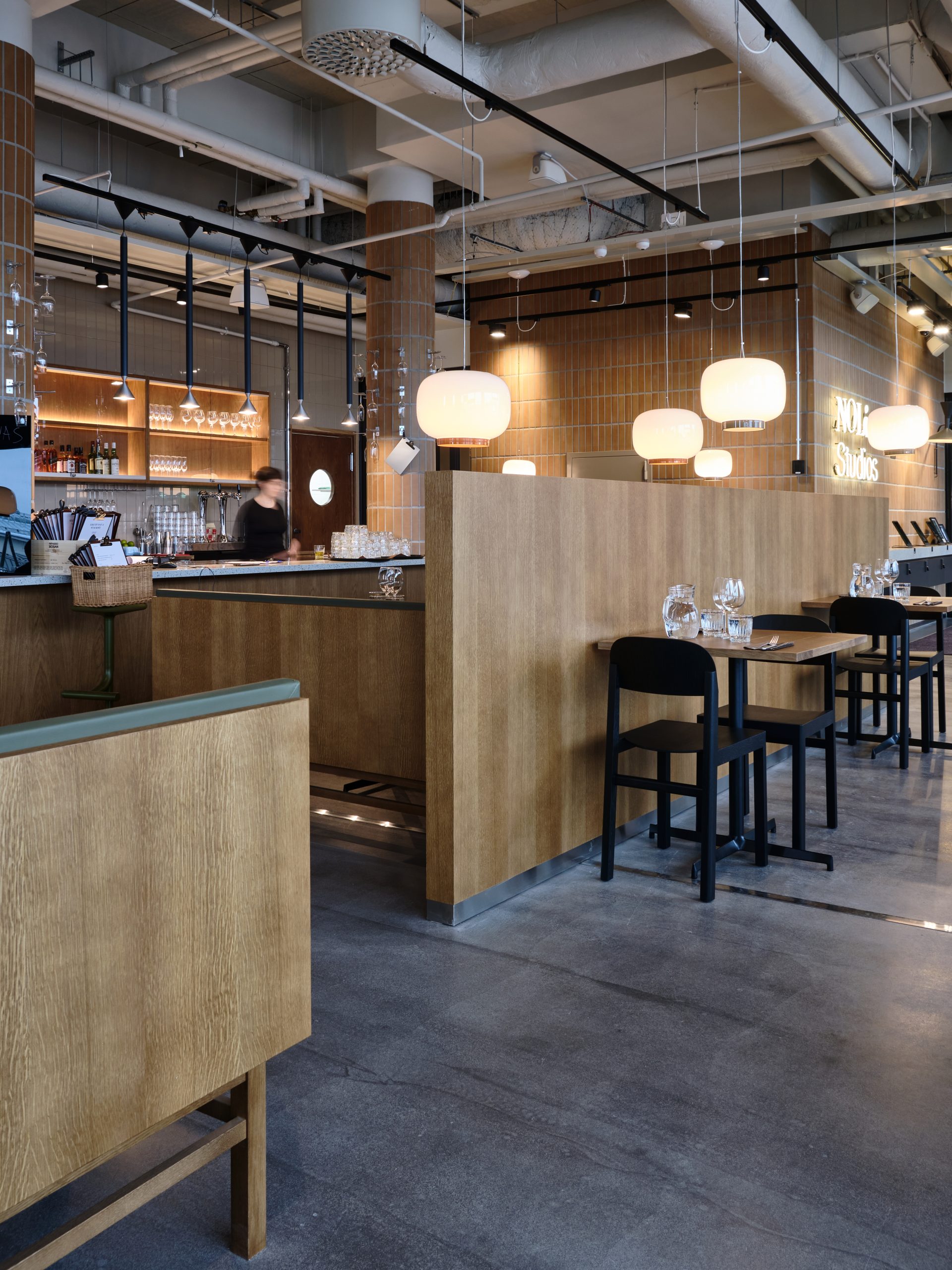 Ravintolan moderni puusisustus yhdistettynä pehmeään valaistukseen luo kutsuvan tunnelman. Suuret ikkunat tekevät ravintolasta valoisan ja tarjoavat näkymän terassille, jossa voi nauttia naapuruston sykkeestä ja seurata illan pimentymistä.
