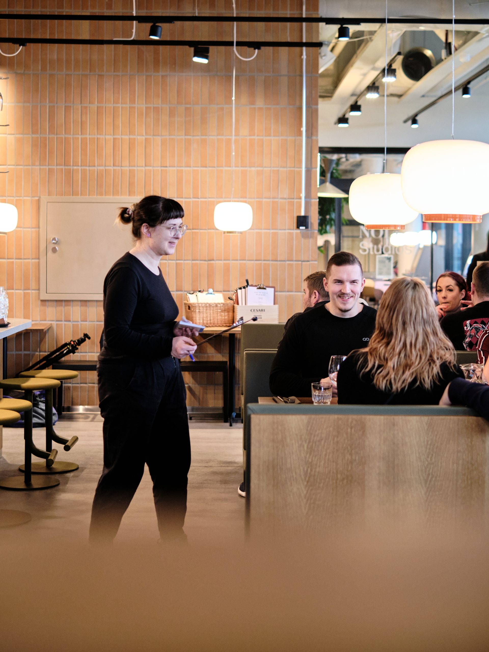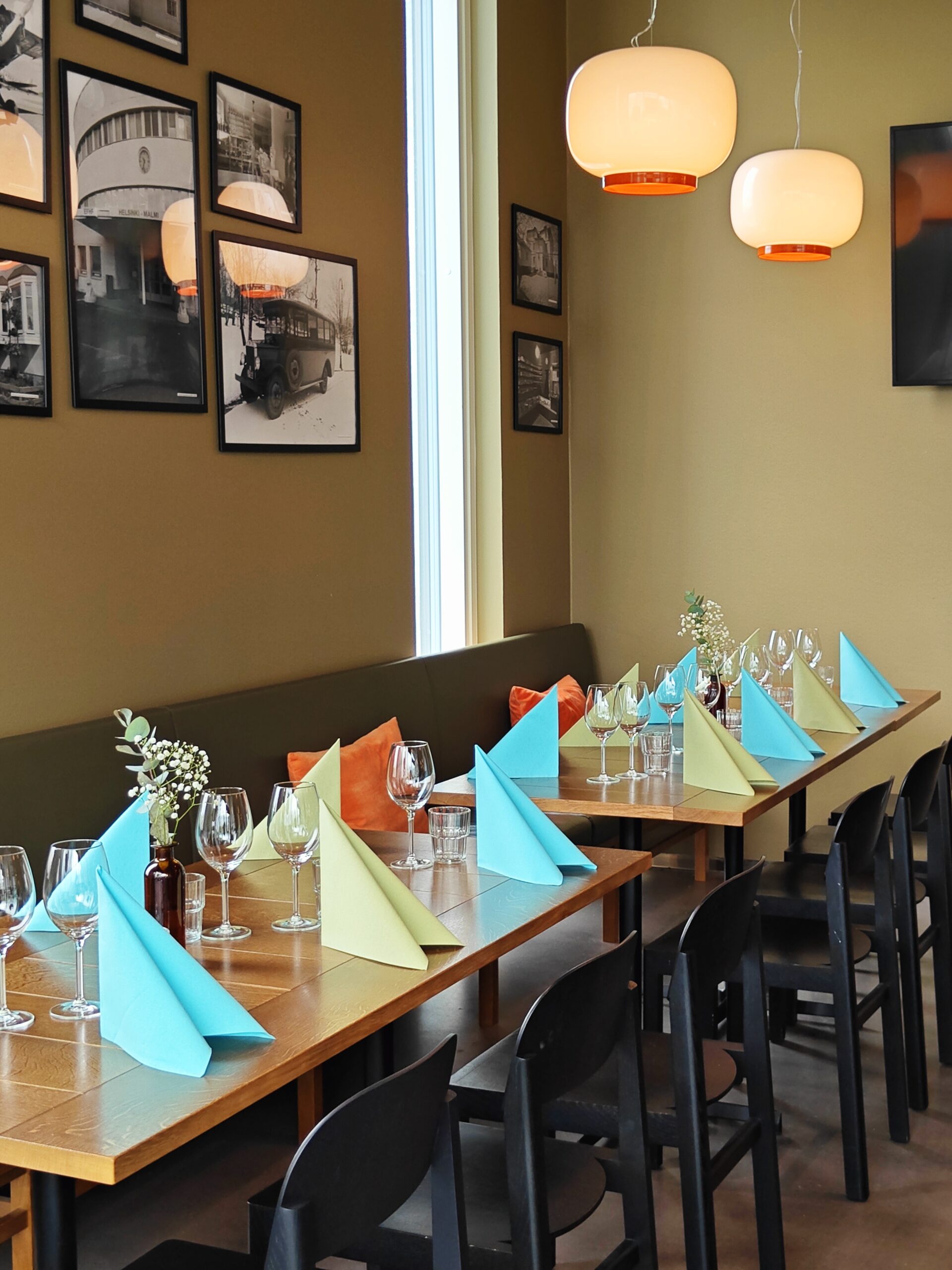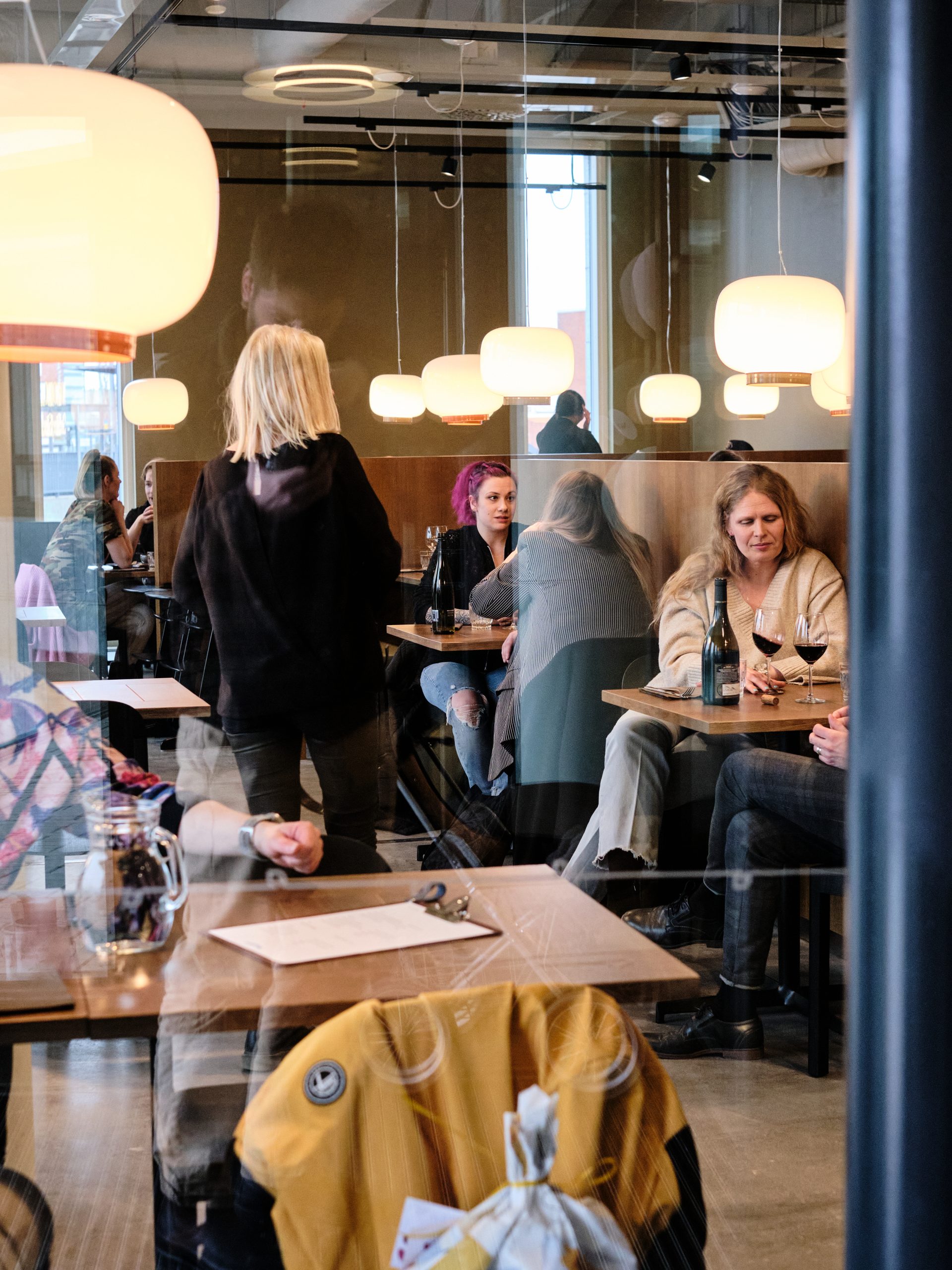 Ravintolan moderni puusisustus yhdistettynä pehmeään valaistukseen luo kutsuvan tunnelman. Suuret ikkunat tekevät ravintolasta valoisan ja tarjoavat näkymän terassille, jossa voi nauttia naapuruston sykkeestä ja seurata illan pimentymistä.