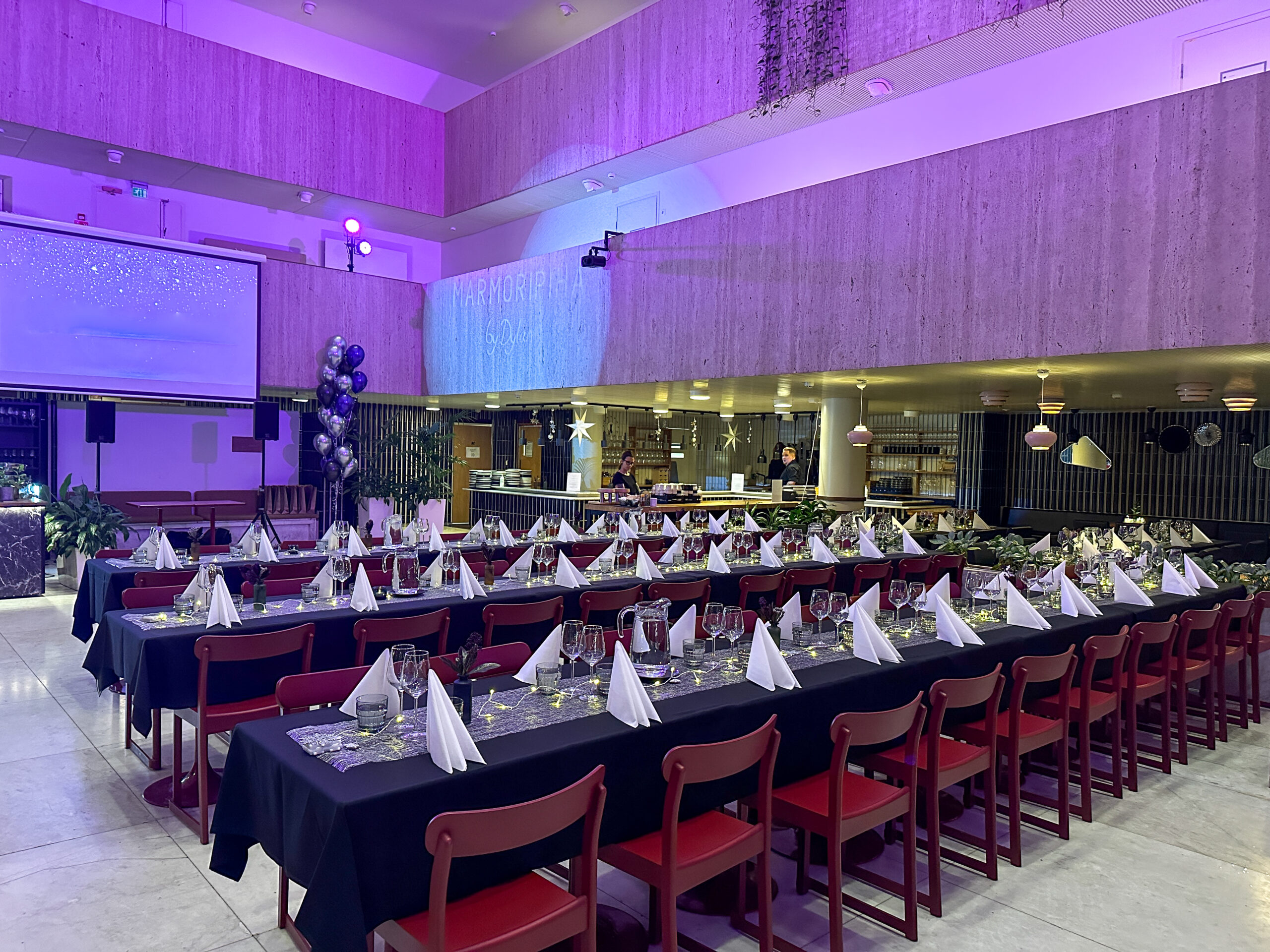 Valoisa ja väljä tila taipuu hyvin monenlaisiin tilaisuuksiin ja meidän marmorilattiallamme onkin ilakoitu monenlaisissa tanssikengissä. Meillä järjestät juhlavat häät, tyylikkään cocktailtilaisuuden, tunnelmallisen illallisen, firman kickoffin, pikkujoulut tai vaikkapa railakkaan tanssitapahtuman! Henkilöitä mahtuu Marmoripihalle juhlimaan istuen 150 ja seisten 300.